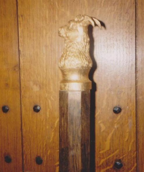 The head of the staff was carved from cherry wood surmounting an ash staff. The head was gilded with dutch leaf.